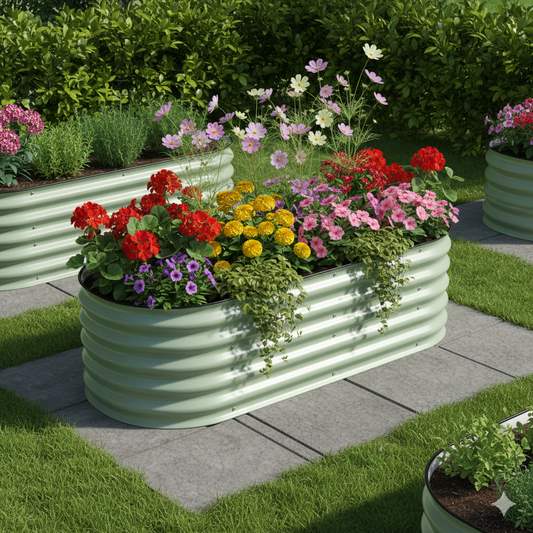 אפור ירוק קרםאדנית ערוגת מתכת מגולוונת ומודולרית לגידול ירקות בגוונים אפור , ירוק וקרם. (גובה 28 ס"מ) ערכה אחת, שתי אפשרויות הרכבה