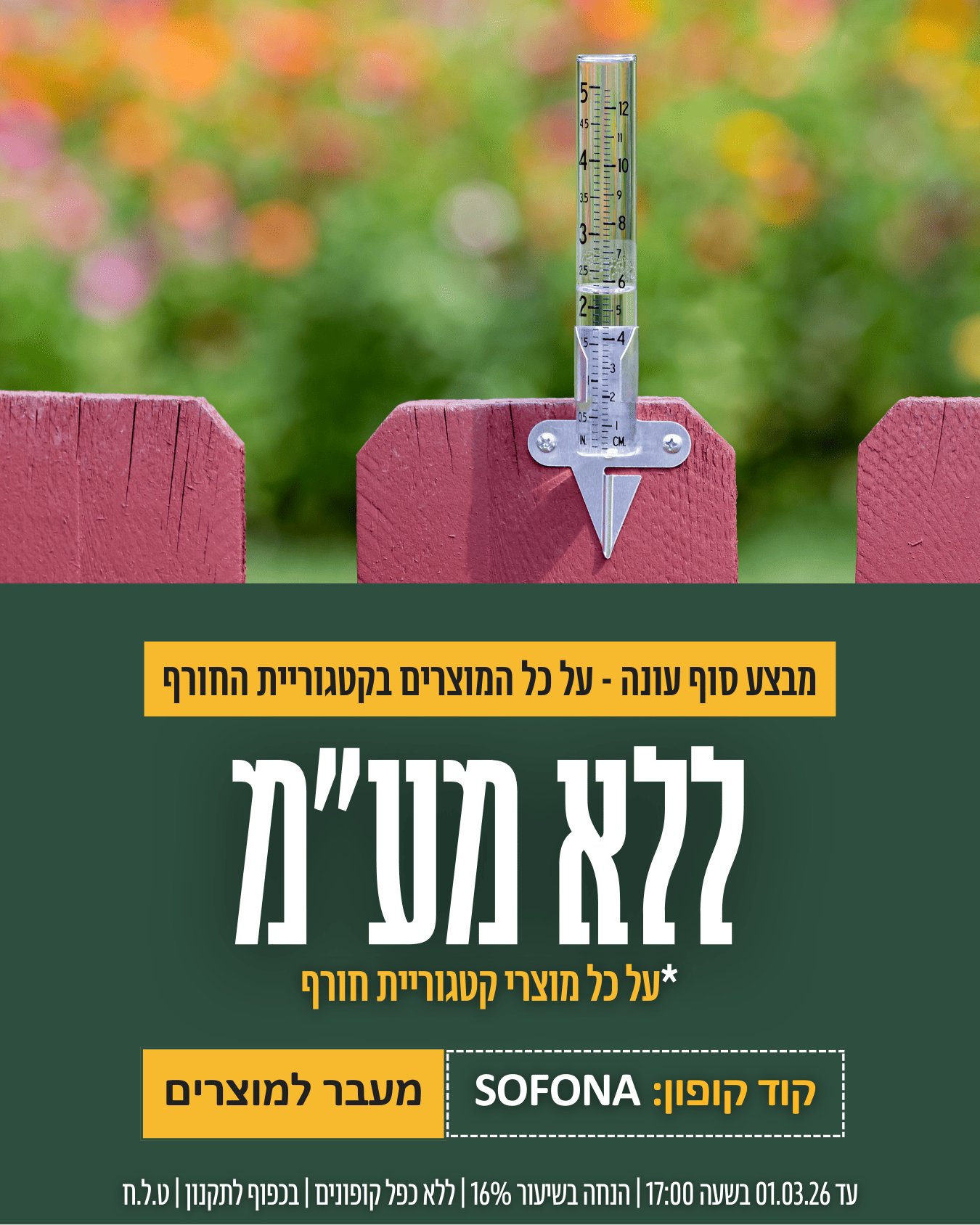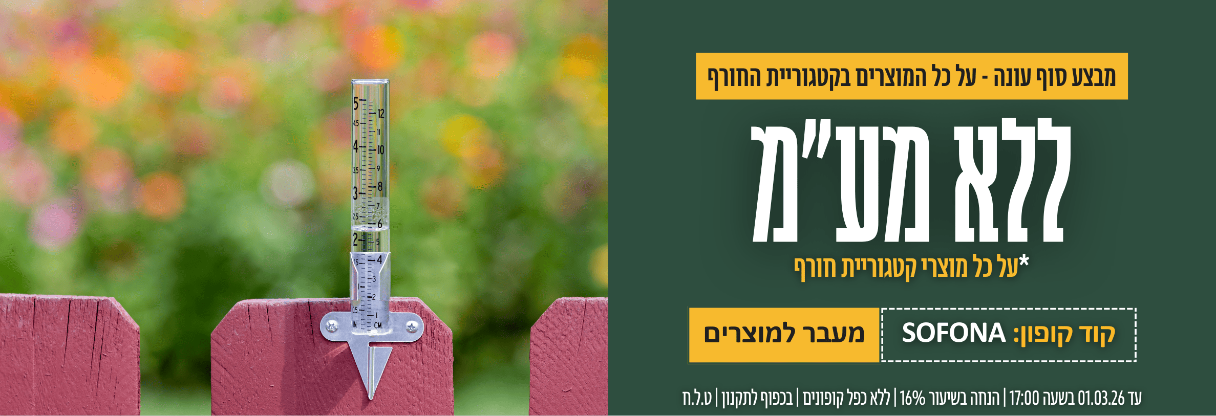 מוצרי גינון וחוץ - מוצרי השקיה, שתילה, כלי גינון, דשנים, אדניות, אביזרים לגינה, הומוס ועוד...