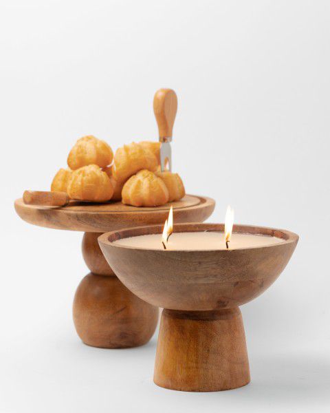 נר שעווה ריחנית קטן בכלי עץ מנגו טבעי GOOSBARRY בעיצוב קערה על רגל 20 ס"מ - לתאורה חמימה עם ניחוח פירותי עדין