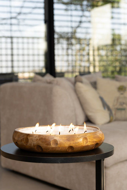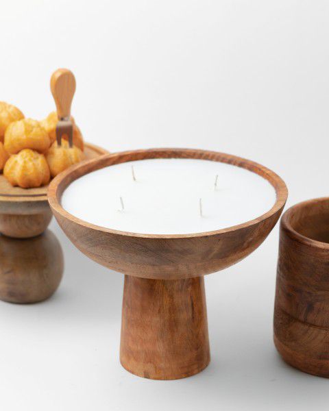 נר שעווה גדול בכלי עץ מנגו טבעי GOOSBARRY בעיצוב קערה על רגל 25 ס"מ - תאורה חמה עם ניחוח פירותי עדין