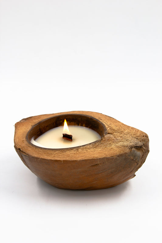 נר שעווה יצוק לקוקוס בתוך כלי עץ טבעי אורגני עם פתיל עץ 20 ס"מ - לתאורה אקולוגית וייחודית