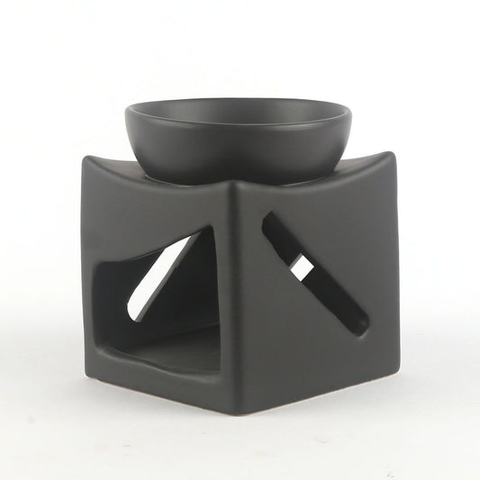 מבער שחור גדול במיוחד 15 ס"מ מחרס בעיצוב קובייה עם פתח אלכסוני להפצת שמנים ארומטיים באווירה רגועה וטבעית בבית