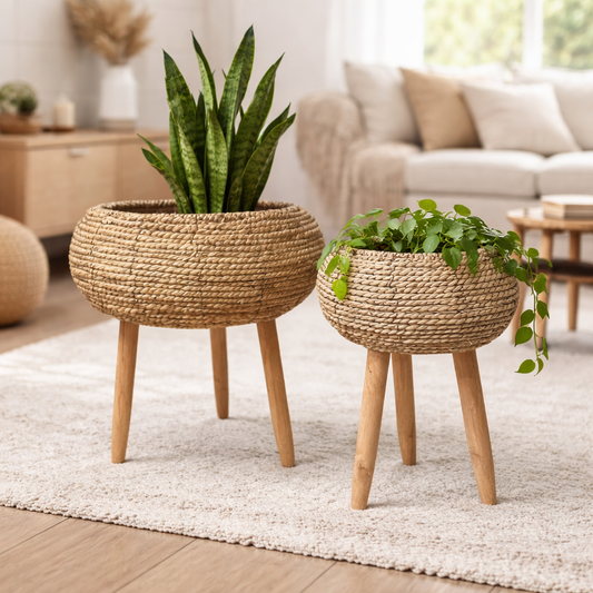 סלסלה קשיחה לעציץ 12 ס"מ עם יריעת פלסטיק שקופה פנימית - כיסוי טבעי מושלם לעציצים קטנים