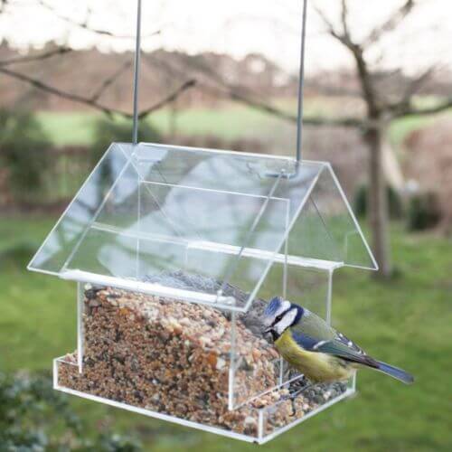 מתקן האכלה לציפורים מפלסטיק שקוף בעל שני תאים לתלייה