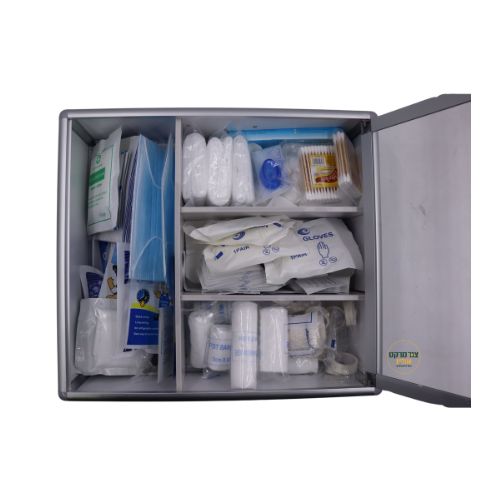 - כולל תחבושות, חומרים לחיטוי, מספריים רפואיים, וציוד לטיפול בכוויות ונקעים.
