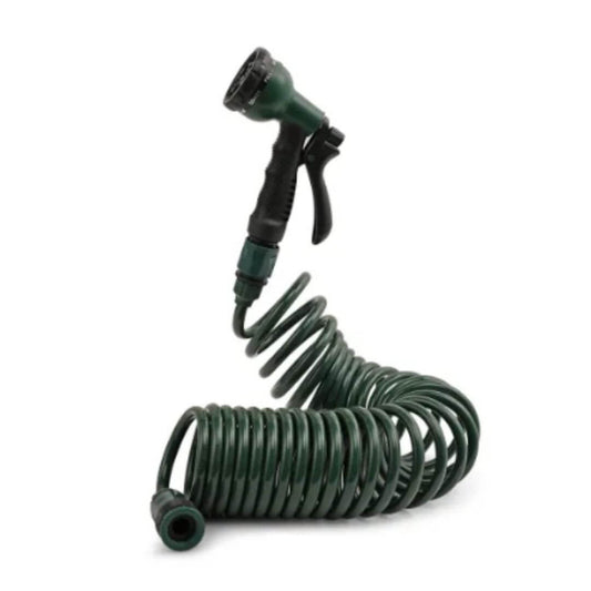 קפיצינור, צינור השקיה 15 מטר קפיצי, ואקדח השקיה 7 מצבים, כולל מחברים ומתאמים
