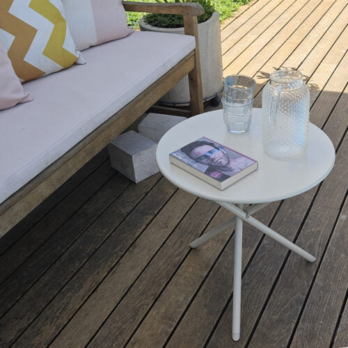 שולחן קפה מתכת עגול למרפסת וגינה בגוון שמנת - פתרון אלגנטי ועמיד לריהוט חוץ!