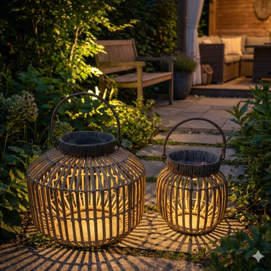 סט זוג עששיות נצרים סולאריות מעוצבות – תאורת אווירה קסומה לגינה ולמרפסת