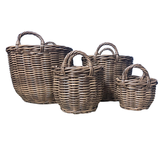 סט 4 סלסלות נצרים קלועות בגדלים מדורגים עם ידיות מעוצבות, המאפשרות מגוון פתרונות אחסון דקורטיביות ברחבי הבית