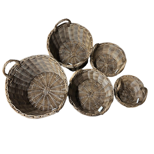 סט 5 סלסלות קש קשיחות מעוצבות בסגנון כפרי ונוסטלגי עם ידיות בגדלים מדורגים