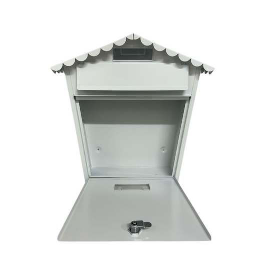 תא דואר לבן לתלייה מעוצב בצורת בית עם גג משונן בגודל 35X33X10.5 ס"מ