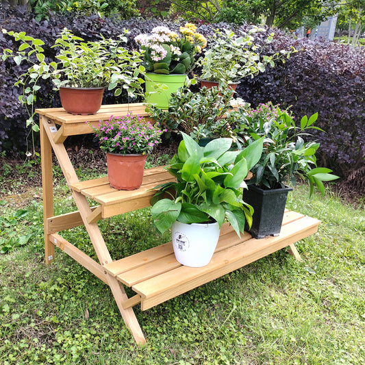 מעמד לעציצים תלת-קומתי מדורג ברוחב 90 ס"מ מעץ מלא בסגנון קלאסי וכפרי