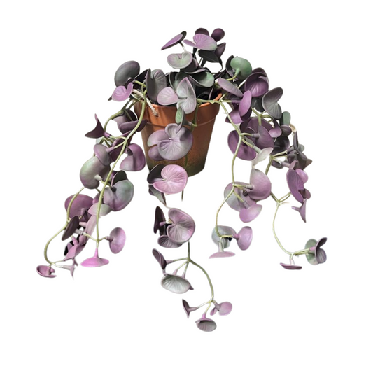 צמח מלאכותי נשפך בעיצוב צמח מטבעות נחושת סגול קטן, מגיע בעציץ בקוטר 10 ס"מ עם חוטי תלייה