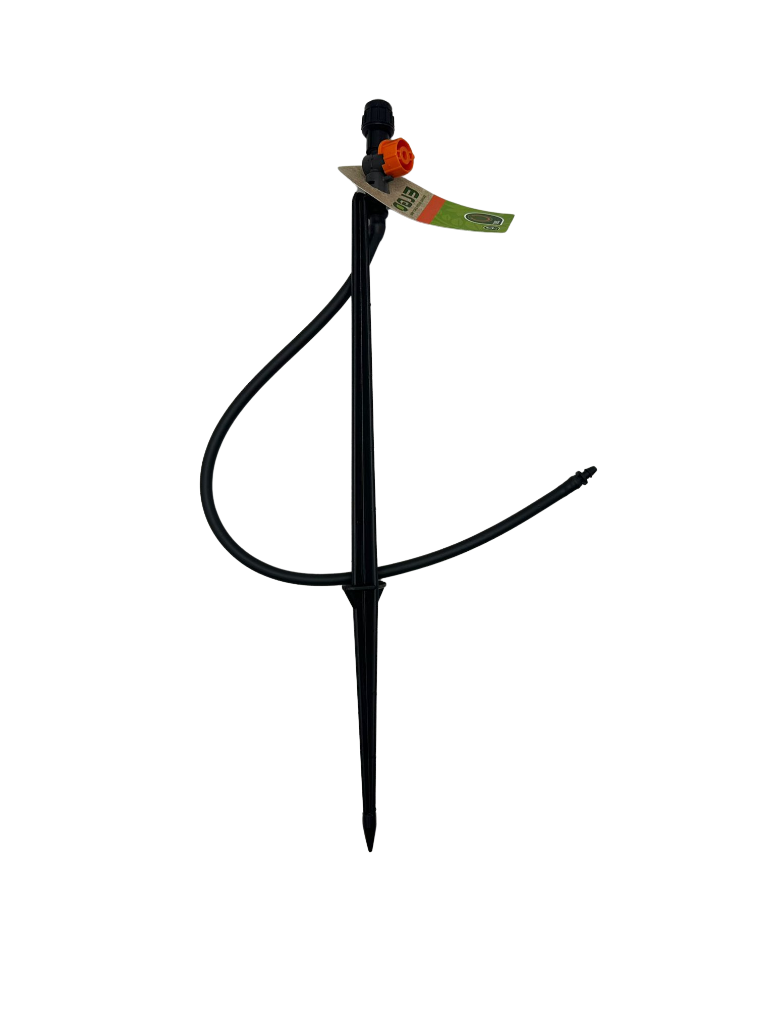 מתז גן איכותי וקומפקטי עם חיבור לצינור השקיה המחובר ליתד על מוט פלסטיק, כיסוי התזה של 360º