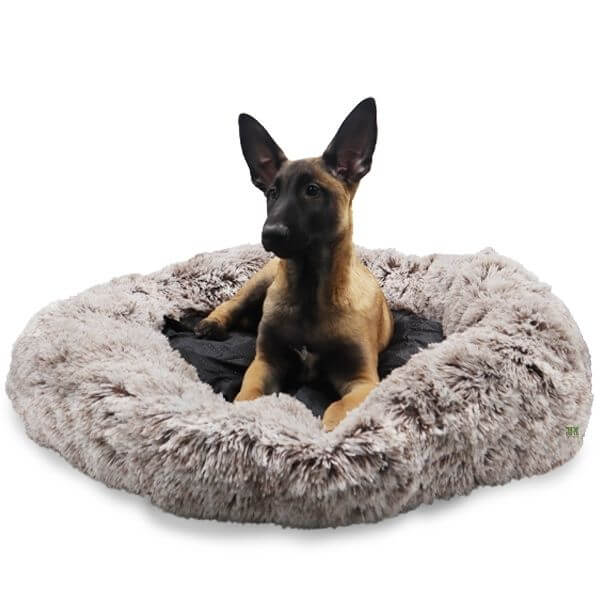 מיטה לכלב מפנקת עגולה ופרוותית, בצבע חום בהיר עם לבן עשויה בד דמוי פרווה.