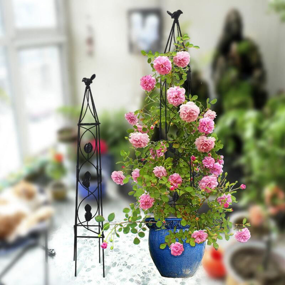 סט 2 עמודי הדליה ממתכת – תמיכה לצמחים מטפסים עם טבעות עיצוב וציפורי נוי