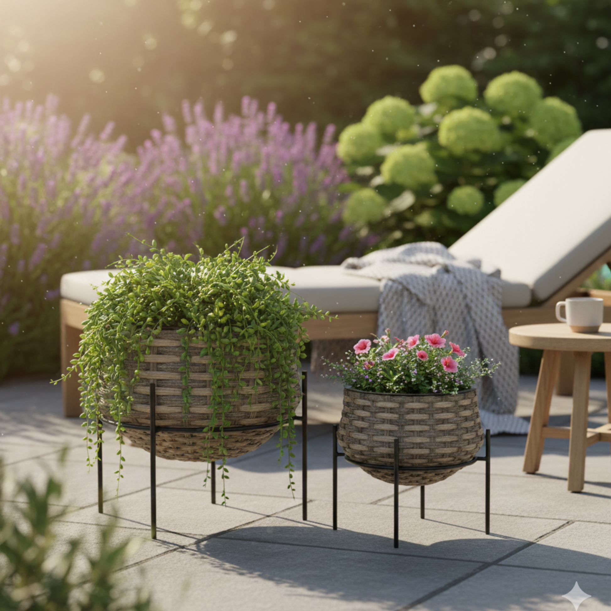 סט זוג עציצי נצרים עגולים על מעמד מתכת – שילוב של טבע ועיצוב מודרני