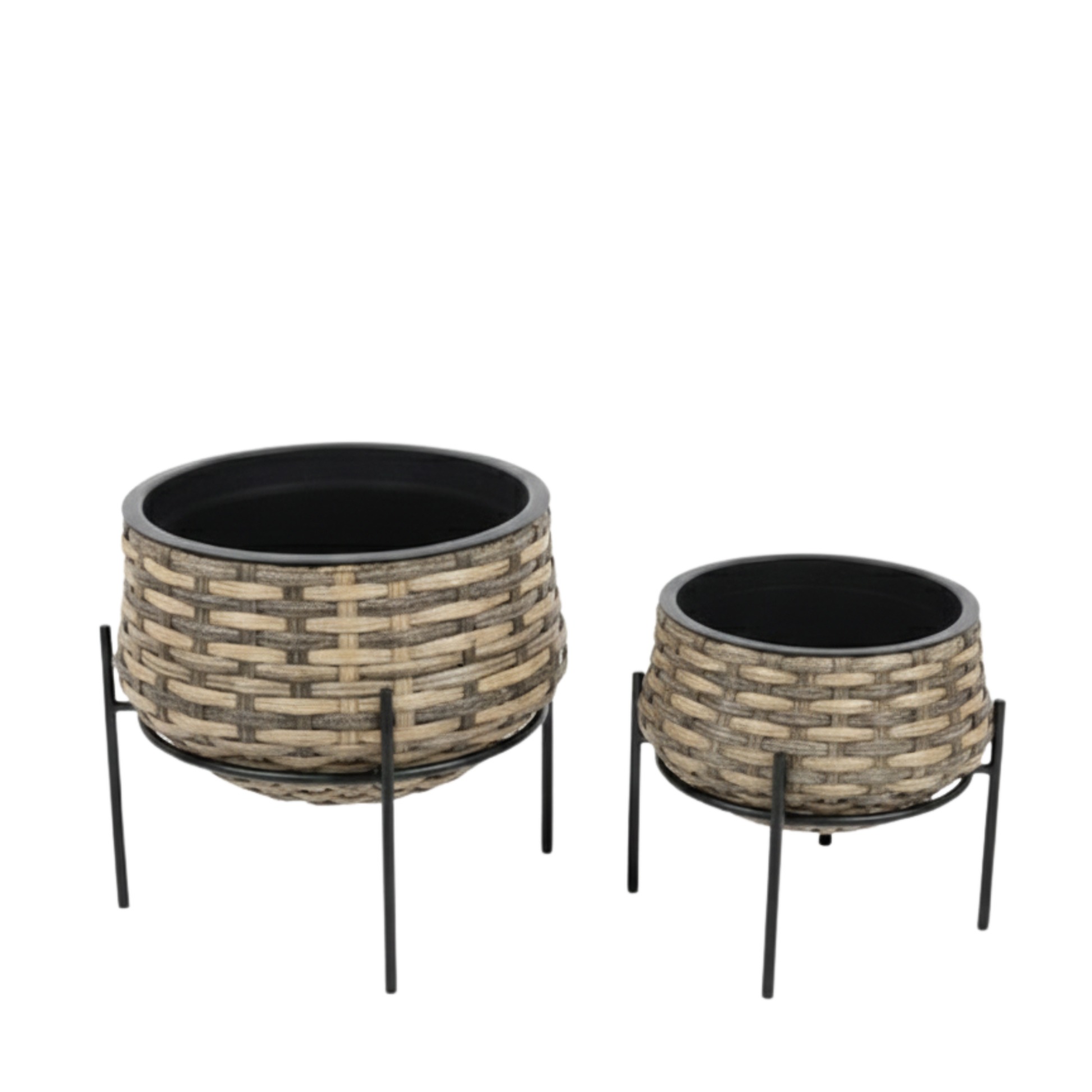 סט זוג עציצי הנצרים הוא תוספת דקורטיבית המשלבת בין המראה הכפרי והחם של הקליעה לבין הקו הנקי והתעשייתי של המתכת. הסט כולל שני עציצים בגדלים שונים (15X28 ס"מ ו-20X36 ס"מ), העשויים במראה קליעת נצרים רחבה בגוונים משולבים של בז' ואפור-חום. כל עציץ יושב בתוך מעמד מתכת שחור דק ועדין המרים אותו מהרצפה ומעניק לו מראה מאוורר ומרחף. העציצים מצוידים במיכל פנימי שחור, המאפשר שתילה נוחה ללא חשש לנזילות מים על הרצפה או על המעמד.