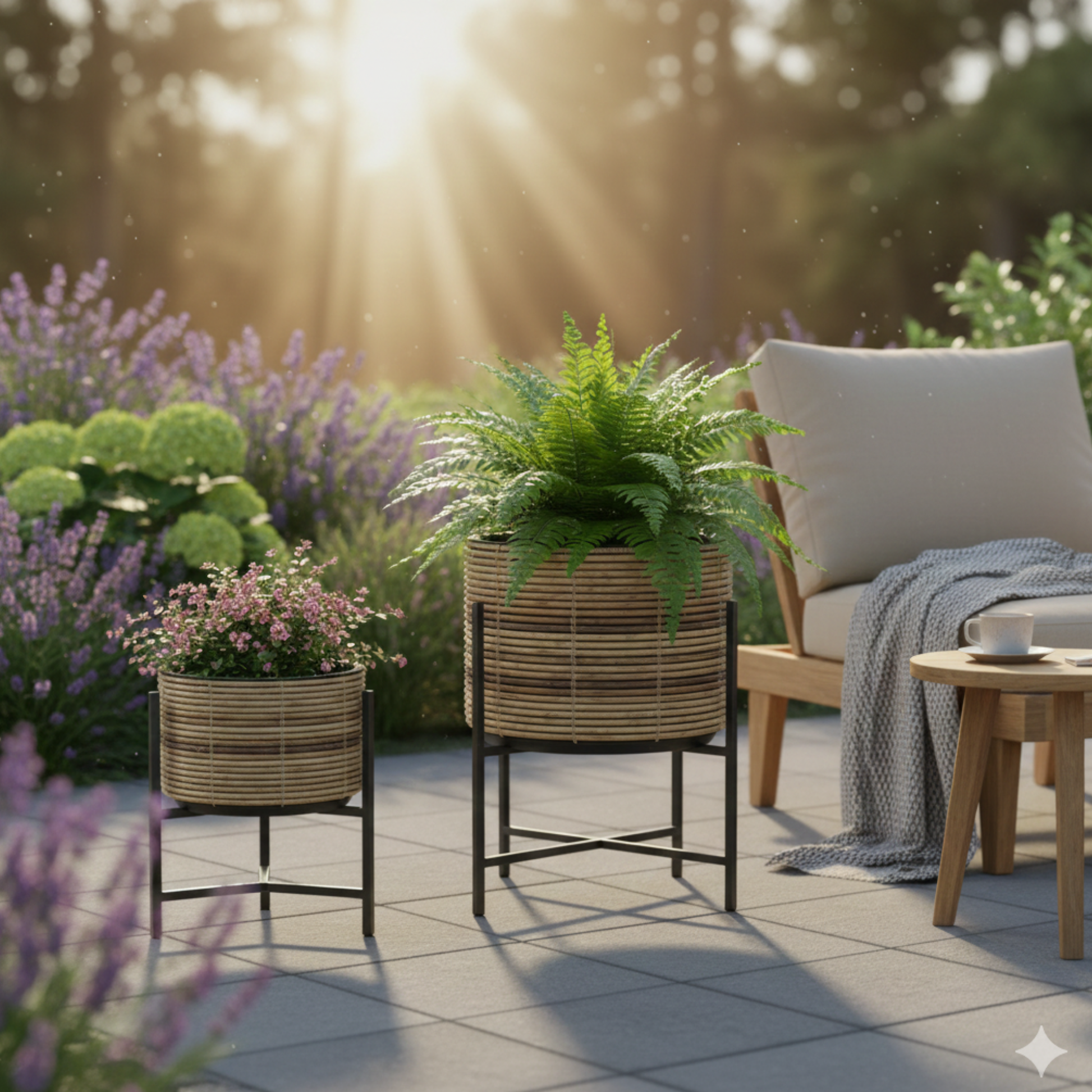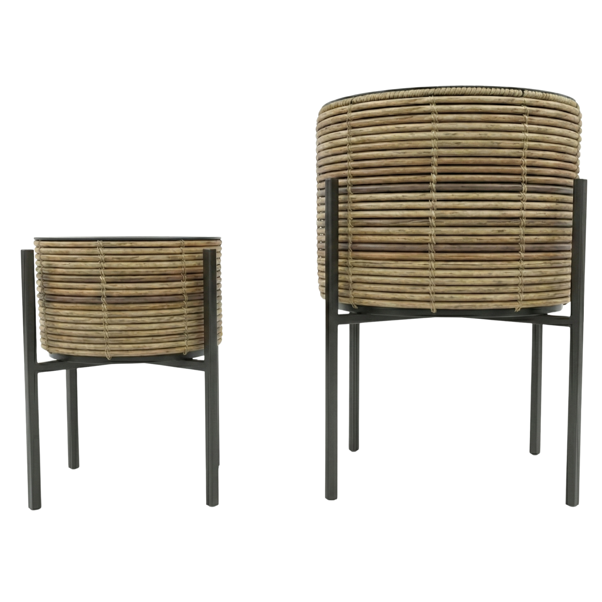 סט זוג עציצי נצרים עגולים על רגליים עם עציץ פנימי בעיצוב בוהו-שיק טבעי
