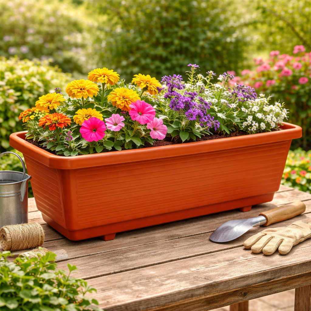 אדנית פלסטיק איכותית באורך 80 ס"מ עם דופן עבה במיוחד, המשלבת חוזק מרבי עם עיצוב קלאסי ונקי בצבע טרה קוטה. האדנית מיוצרת מחומר פלסטי חזק ואיכותי, בתוספת הגנה מפני קרינת UV, לשמירה על הצבע והעמידות לאורך זמן גם בתנאי חוץ.